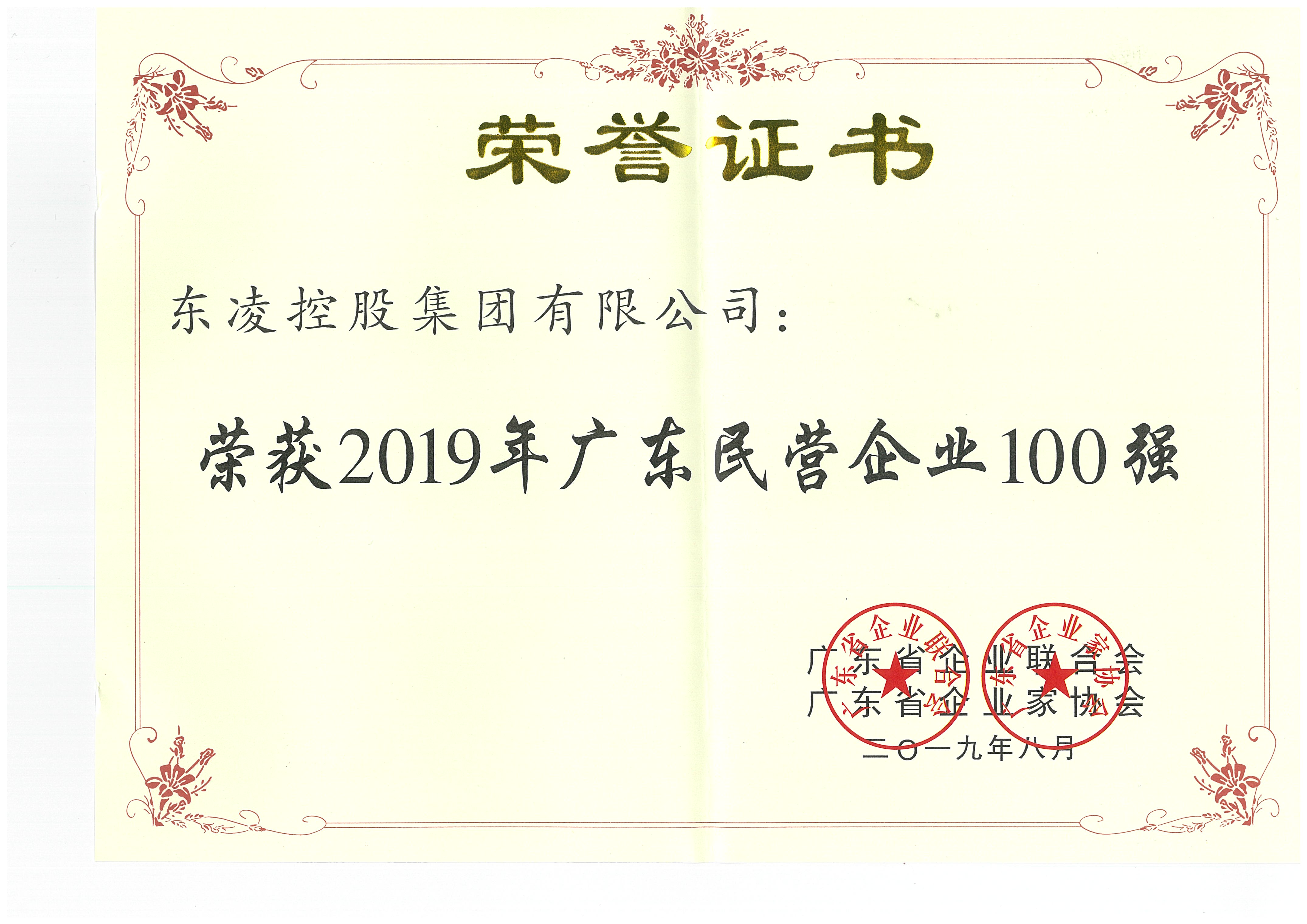 2019民营企业100强证书