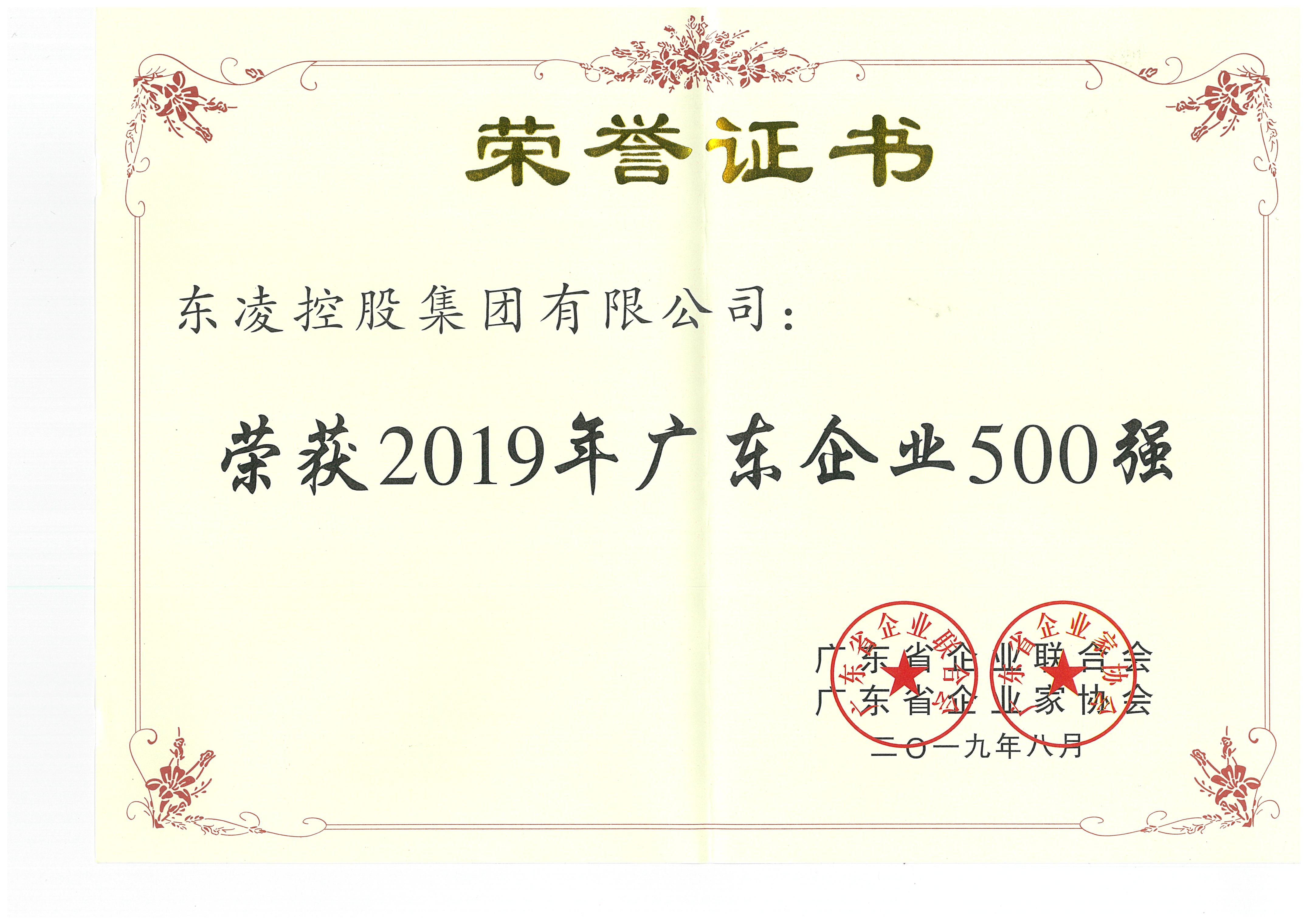 2019年广东企业500强证书