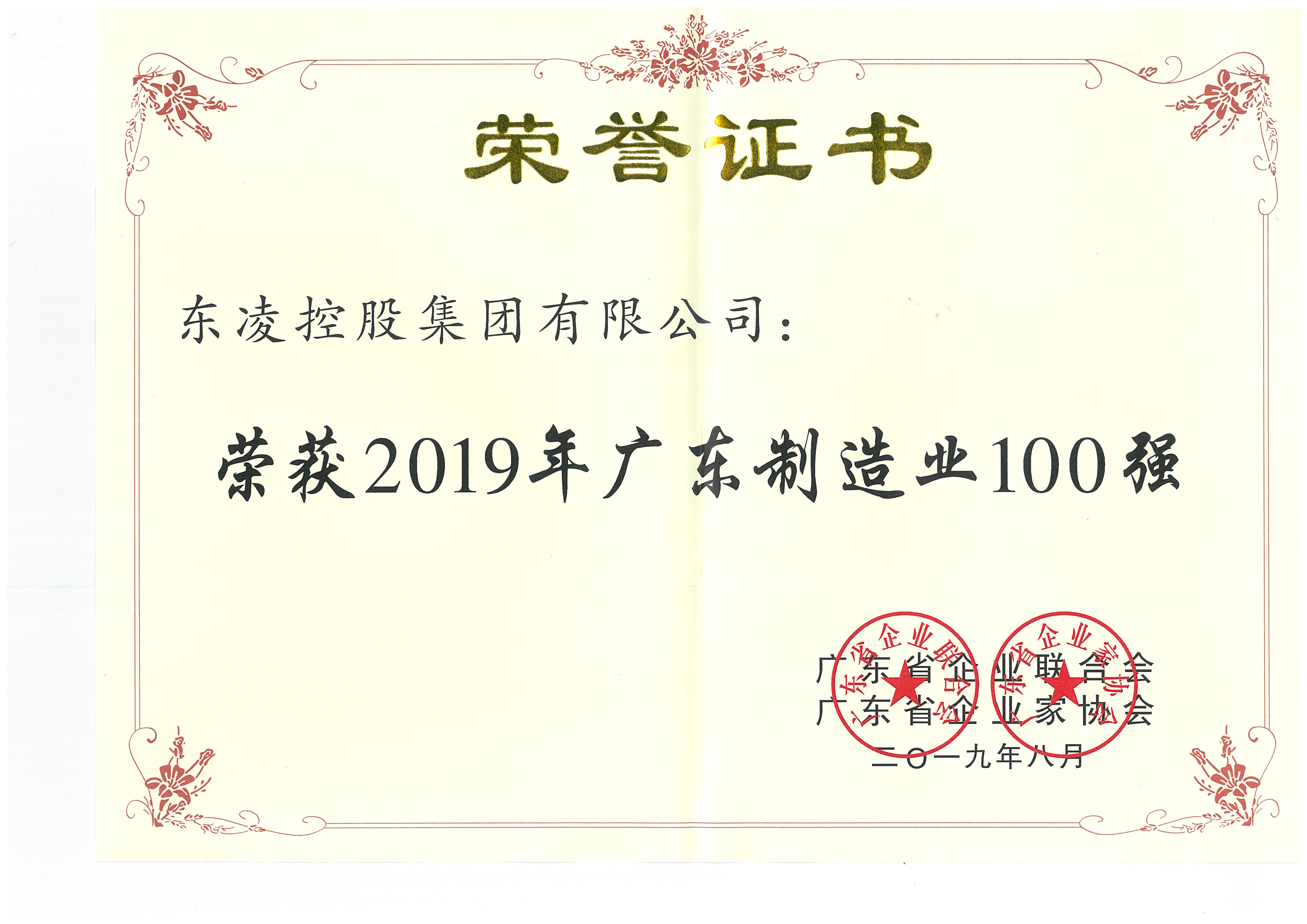 2019年广东制造业100强证书