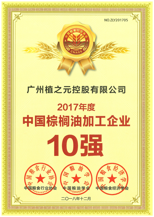 2017年度中国棕榈油加工企业10强荣誉证书